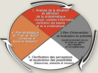 L'approche est de type humaniste-existentielle et met l'accent sur le moment présent, sur la capacité de la personne à prendre conscience de son potentiel, de ses difficultés actuelles, de les comprendre et de modifier en conséquence sa façon d'être ou d'agir. Les entrevues sont d'une durée d'une heure quinze et le nombre de rencontres varie selon la problématique et la situation de chacun.